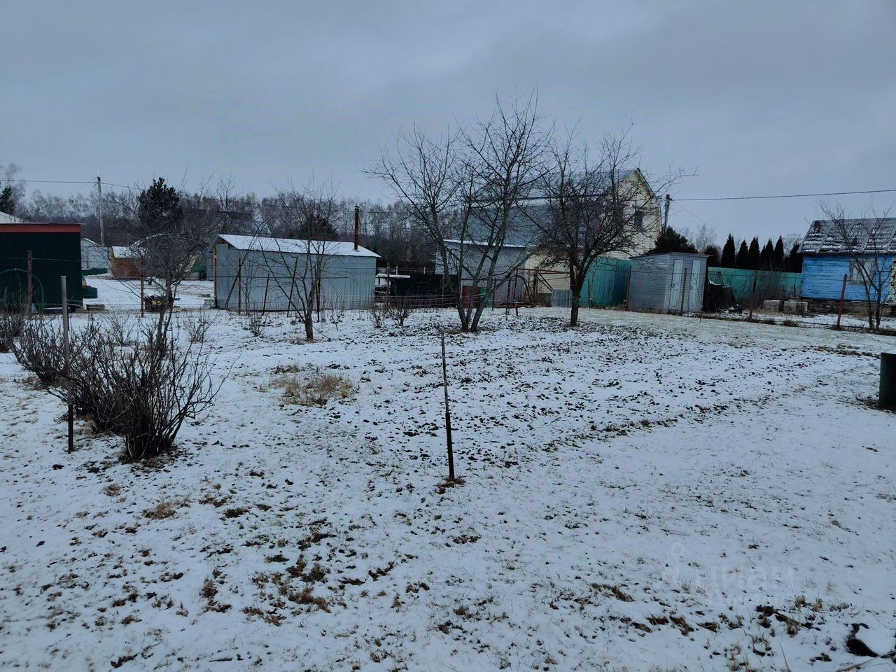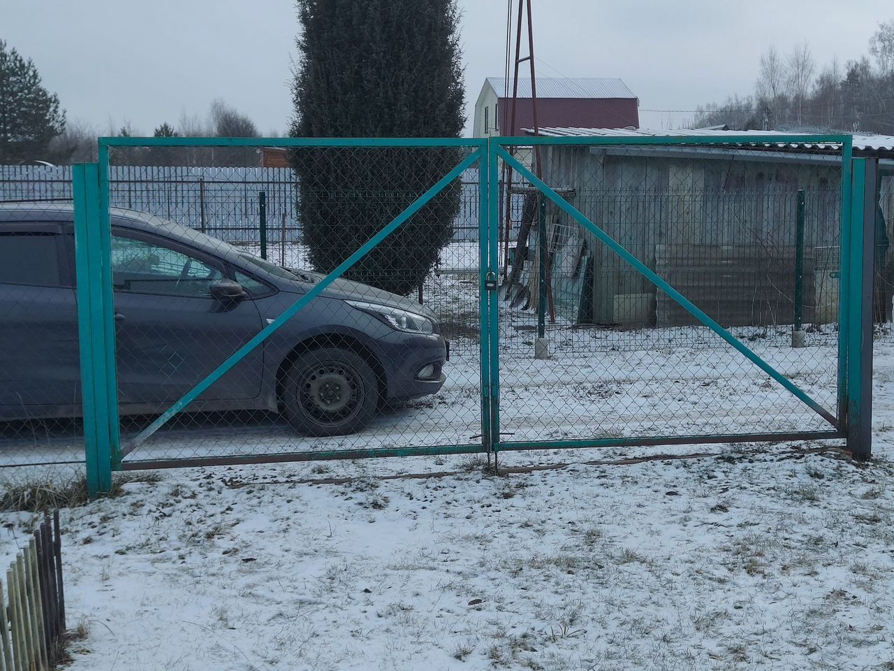 Забор из сетки-рабицы по периметру участка, есть двое ворот.