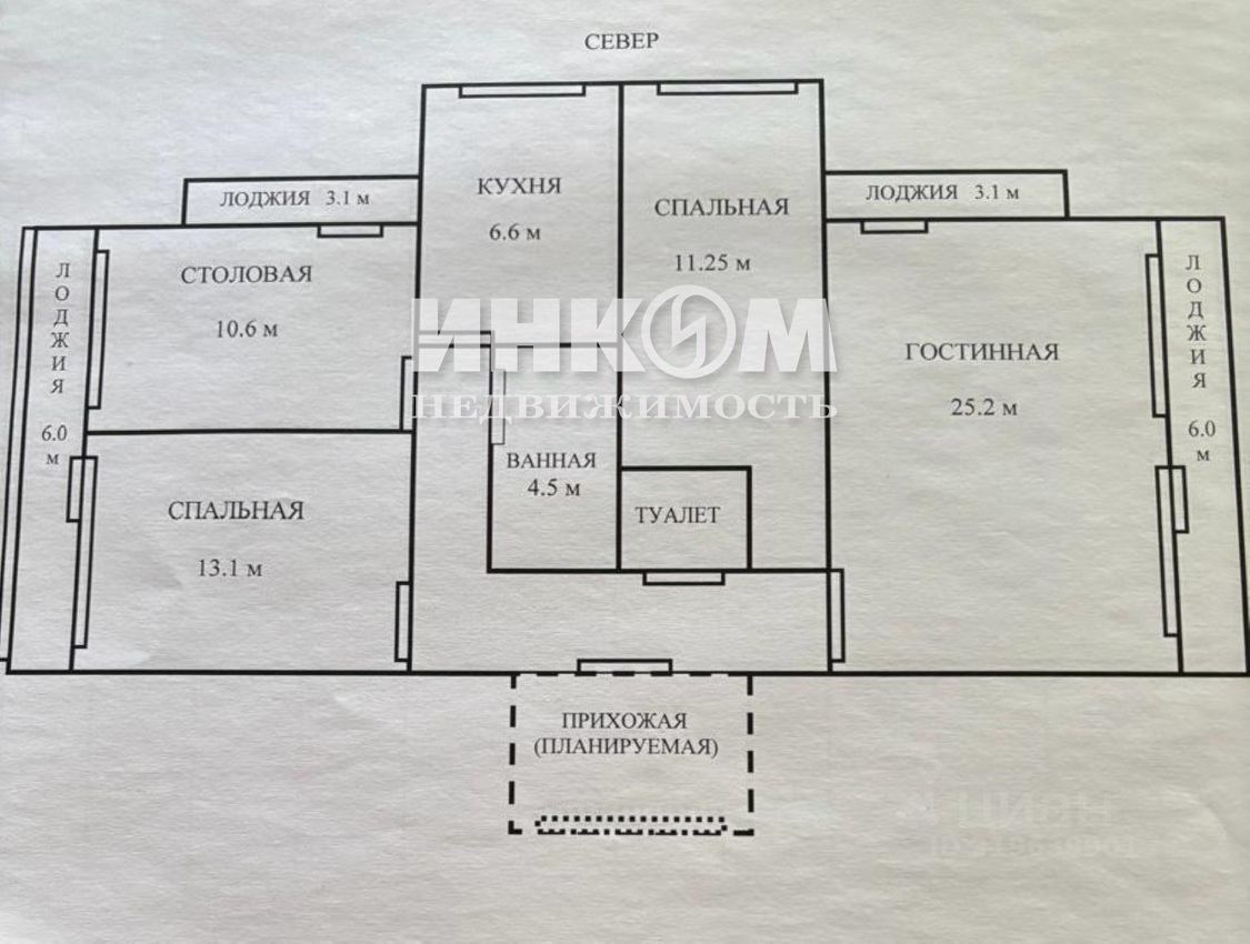 Планировка: - Гостиная 25,2 кв.м с выходом на две лоджии (3,1 и 6 кв.м) - Спальня 11,25 кв.м - Столовая 10,6 кв.м с выходом на лоджию (3,1 кв.м) - Вторая спальня 13,1 кв.м с выходом на лоджию (6 кв.м) - Кухня 6,6 кв.м - Раздельный санузел, просторный коридор