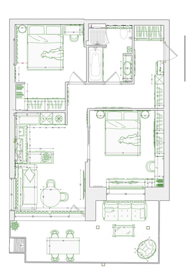 В квартире wi-fi, 2 кондиционера, стиральная и сушильная машины, посудомоечная машина, телевизор будет приобретен и установлен до заселения. Также будет приобретена садовая мебель на террасу.